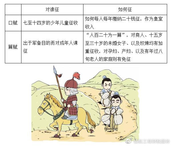 这与当时的赋税与徭役制度有着直接的关系。自给自足的小农经济下,对商品课税的经济基础并不存在,主要盛行的是以纳税人本身及其财产为课征对象的“人头税”和“财产税”(主要是田赋)。此外,百姓还要无偿承担“军役”、“力役”、“杂役”等各种徭役。