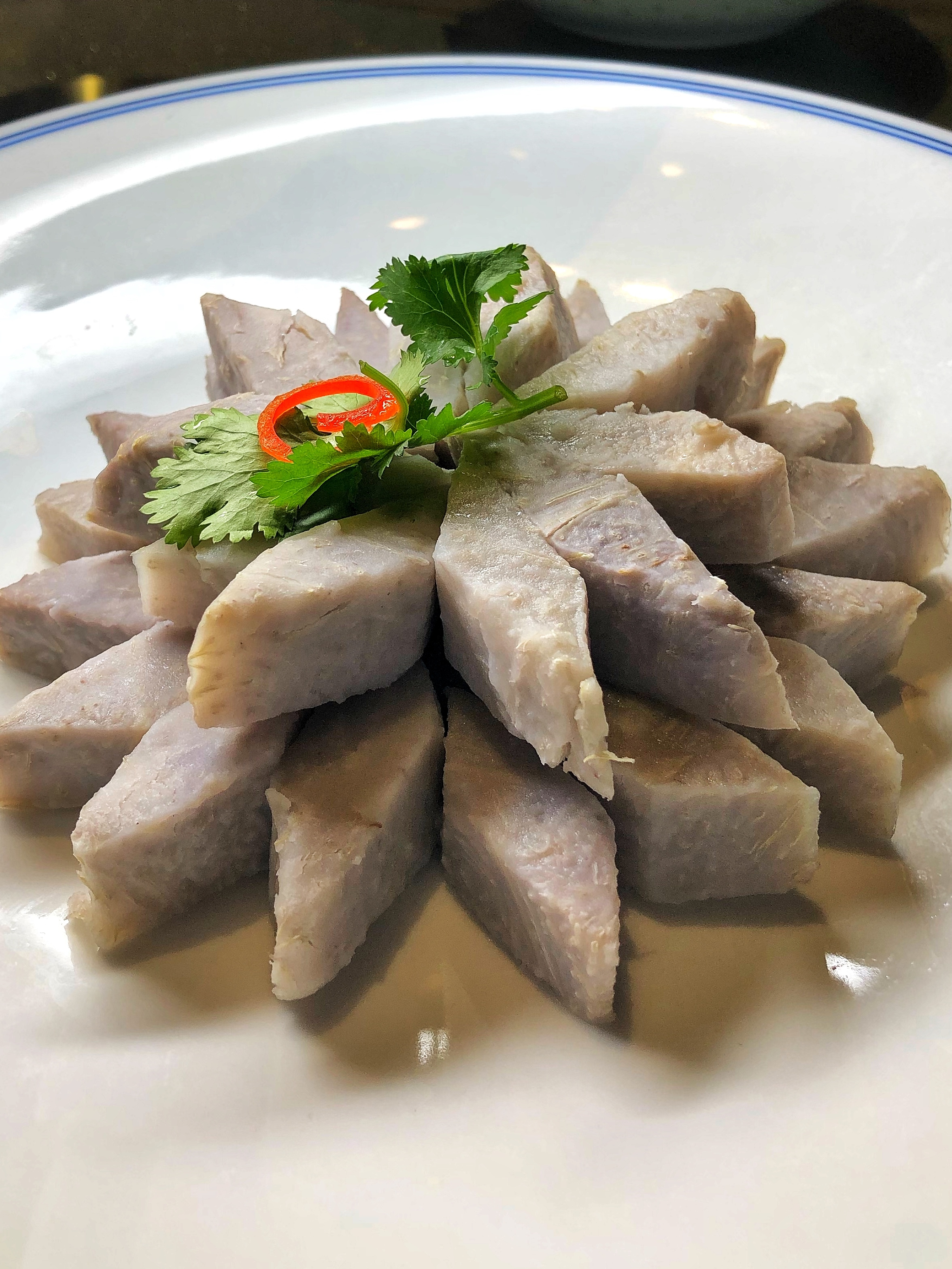 为了把表现鲜味进行到底,江南渔哥还有更多的绝活:把蟹肉弄成酱,奉化芋艿蘸着蟹肉酱吃,这只是一道冷菜——奉芋配蟹肉糊。