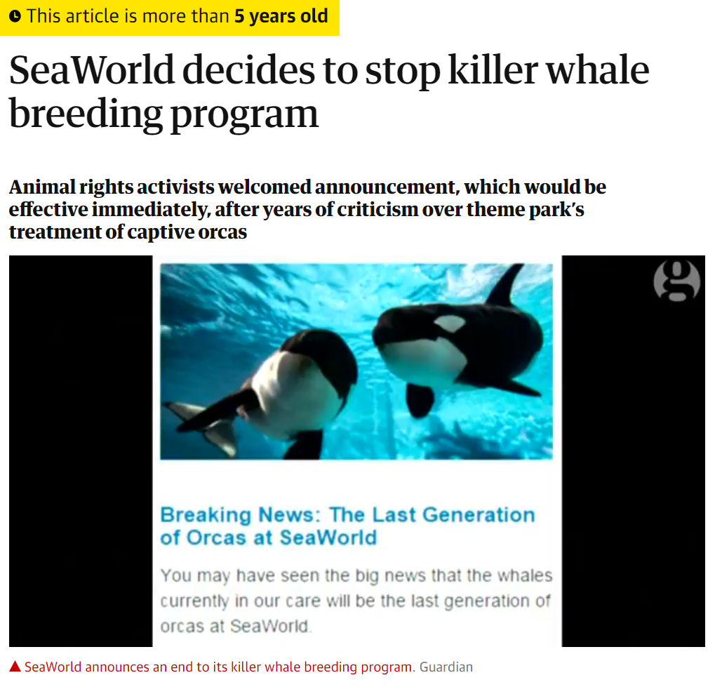 2016年,SeaWorld宣布将停止圈养繁殖虎鲸,在最后一批已经被圈养的虎鲸去世之前寻求转型,并且也将不再引入新的虎鲸 | Guardian