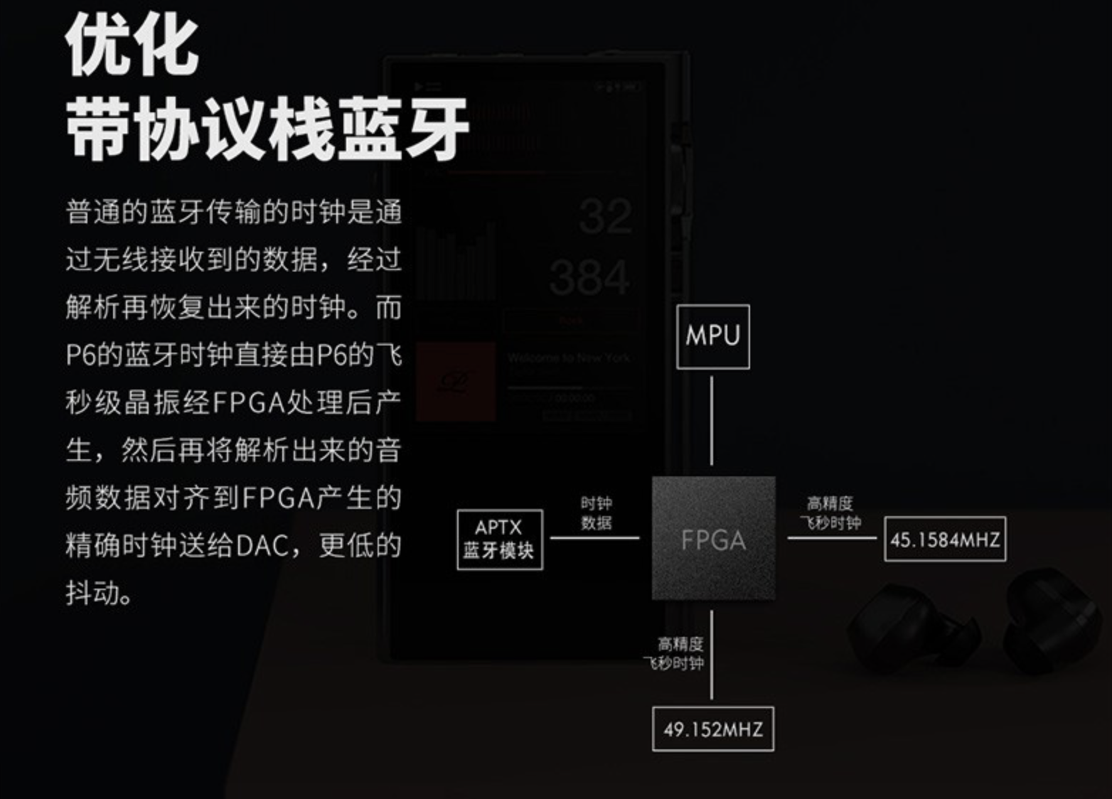 光有协议还不够,回放硬件更加关键。即使经过蓝牙协议传输后得到相对无损的源文件,还需要经过高品质的解码、放大和扬声器发声单元才能发声,其中任何一个环节,都会对最终的音质产生质的影响。对于发烧友来说,TWS真无线之类的耳机是瞧不上的,最主要的原因正是其中的解码放大模块过于孱弱,即使发声单元品质不错,但还是会产生瓶颈效应——推不好耳机。像AirPods Pro里的那枚H1芯片集成了DAC和AMP功能,和独立的hifi解码、放大器无法相提并论。拿一个标准的无线hifi音频器材举例——乐彼售价近2万5的P6PRO,它本身是一个支持本地播放的hifi播放器,但也可以开启蓝牙当解码耳放。其hifi蓝牙模式是通过机内一块FPGA芯片实现的——首先是兼容LDAC、aptx HD等主流无损传输协议,之后由这块可编程芯片来处理时钟数据,减少数字信号传递产生的失真,再通过机内的高品质独立DAC和模拟放大电路来实现无线hifi。