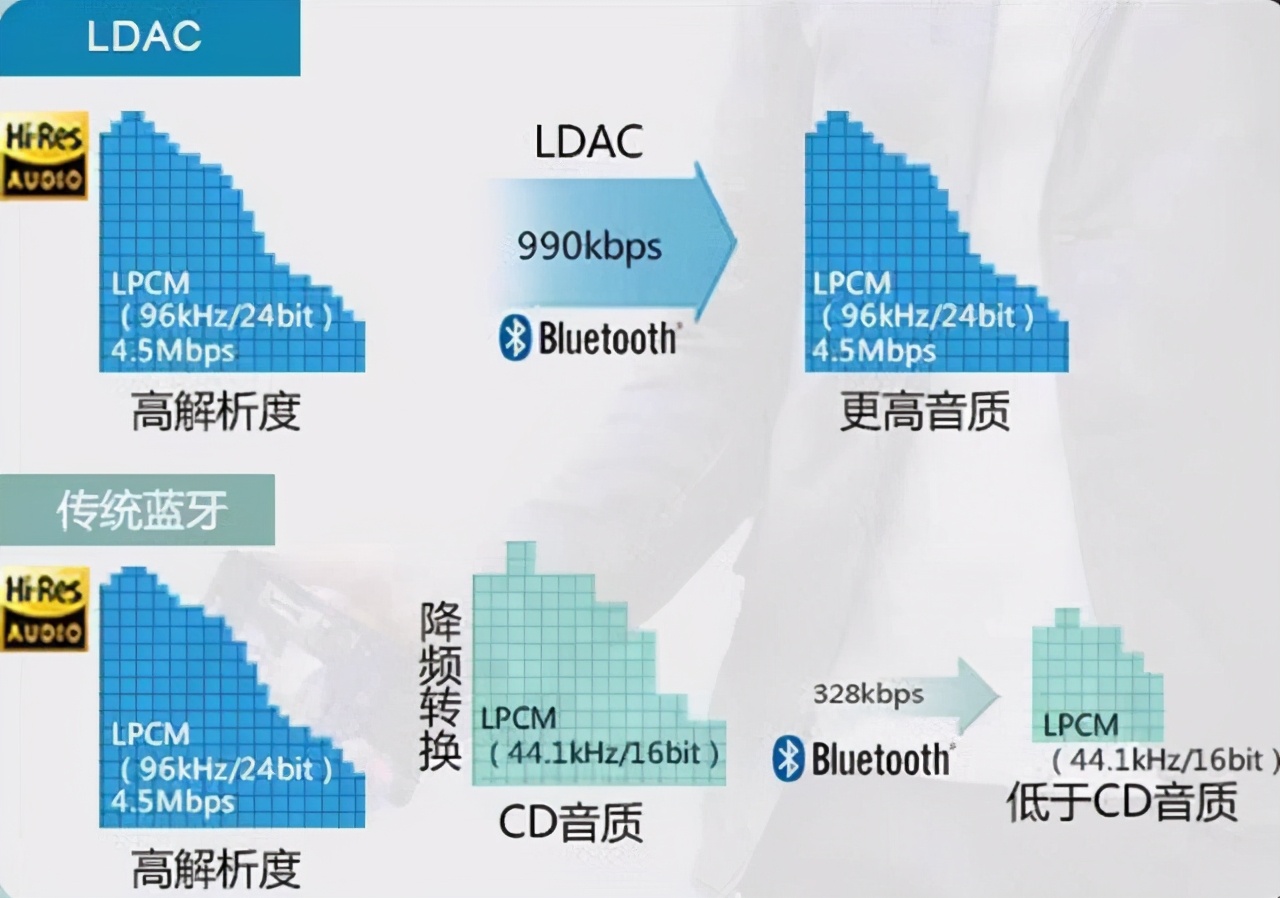 这就是苹果推出hifi版apple music所面临的最大问题。如果要让大众觉得值,或者让首批相对最在意音质的发烧友觉得值,必须解决“如何更明显表现出音质差距”这一问题。主流趋势蓝牙不可逆,那么就先讨论蓝牙连接的情况——就信号传输与处理原理而言,Apple Music里的数字音频文件先通iPhone的蓝牙模块发射出去,再通过AirPods的蓝牙模块接收,这个过程中会有一个“降低采样”的过程,哪怕源文件是24bit/96KHz的高解析音频,实际传化为蓝牙信号时就变成了328kbps的mp3有损音频,失真也会高至0.017%。目前主流的无损传输协议是索尼的LDAC和高通的aptX HD,支持的传输码率均明显高于苹果的AAC和SBC,在高通迟迟不给iOS设备aptX授权的情况下,苹果是否得先自己搞一个新的无损协议呢?