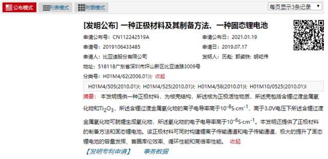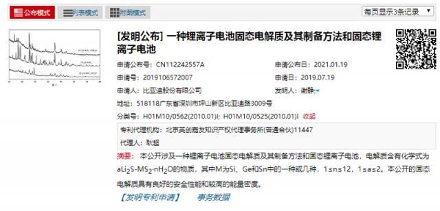 在2019年7月就已注册的部分专利中,比亚迪的这两项技术值得注意:其一名为“一种正极材料及其制备方法、一种固态锂电池”,其二则是“一种锂离子电池固态电解质及其制备方法和固态锂离子电池”。从专利名即可看出,比亚迪对固态电池的正极材料和固态电解质的制备技术都有所成。