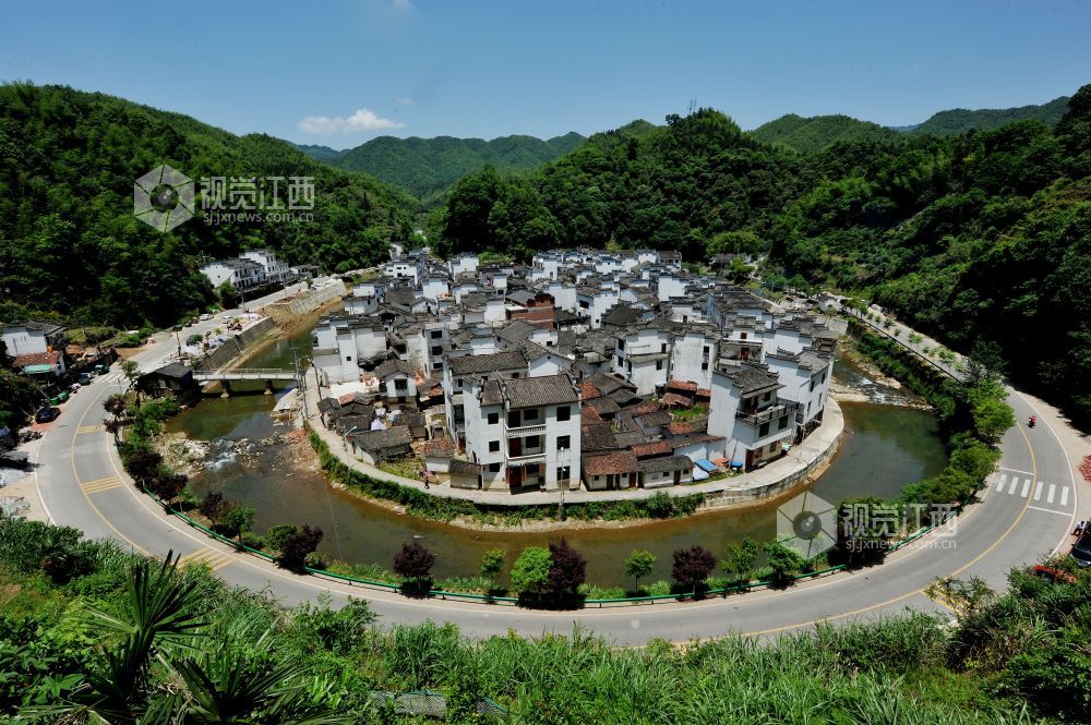 2021年5月9日,在江西省上饶市婺源县大鄣山乡拍摄的圆型村落菊径村全貌。据了解,这个具有典型的徽派建筑村庄位于江西省上饶市婺源县大鄣山乡的村落因为地势非常独特,俯瞰村庄全景,就是一个大大的“圆”形。人越往上走,越能感觉圆圆的村庄越显神奇与独特,崎岖公路环河,徽派建筑的粉墙黛瓦,飞檐翘角,格外显得神奇独特,宛如世外桃源的小山村,令人叹为观止。同时也引成千上万的国内外摄影爱好者前来采风。被人们誉为“中国最圆的村庄”。 视觉江西 卓忠伟、程津 摄