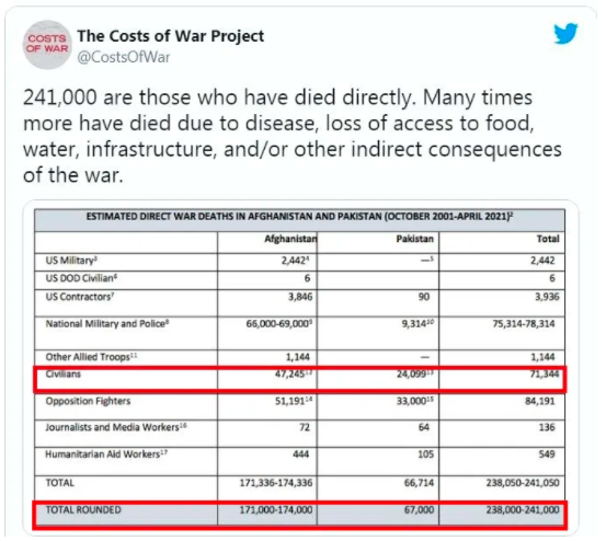 据美国波士顿大学发起的“战争代价”项目统计,自2001年以来,阿富汗战争已累计造成约24.1万人死亡,其中包括7.1万多名平民。