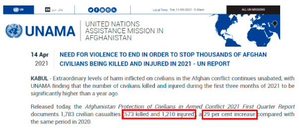 联合国驻阿富汗援助团的报告显示,今年第一季度,阿富汗共有573名平民被杀,另有1210人受伤,平民伤亡人数比去年同期增加了29%。
