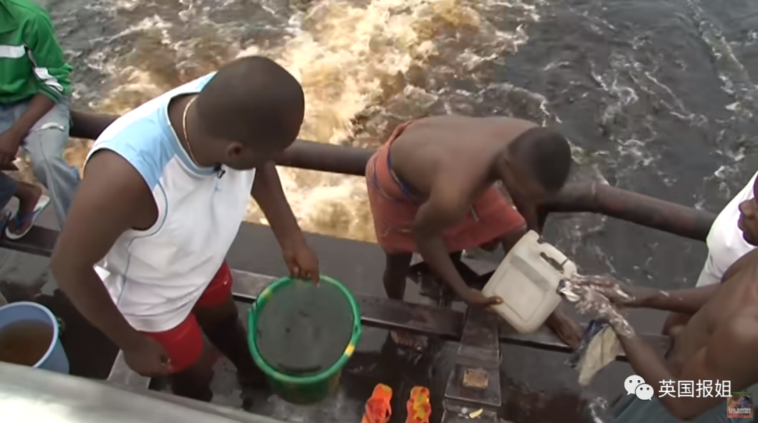 终于到了淋浴区,拿出事先准备好的水桶,用绳子拴着一次次扔向河里打水上来。这种打水方式特别危险,因为船尾有带动螺旋桨的露天发动机,一直在漏电,稍不留神就会触电。