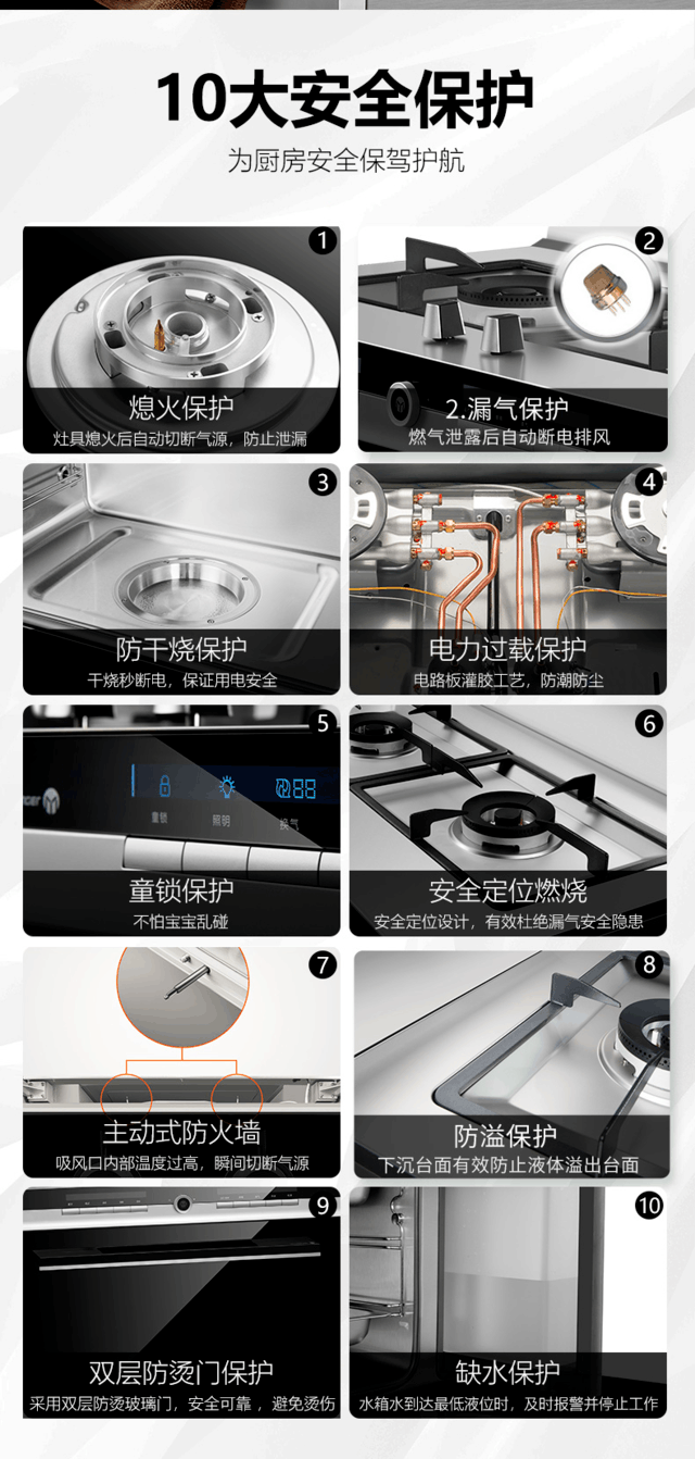 除了以上几个重要的选购指标外,还需要注意蒸烤一体集成灶是否拥有安全保障功能,比如熄火保护、漏气保护、童锁保护等等,为全家人的使用安全保驾护航。