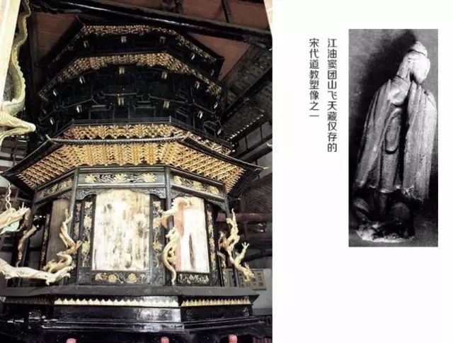 窦团山飞天藏是另一处宋代转轮藏,建于南宋淳熙八年。和隆兴寺转轮藏相比,上部依《营造法式》规定饰有精美的天宫 楼阁,其下檐平座处更是斗拱密促,结构十分繁复,华板上则有大量的木雕花卉,整个制作显得异常精巧。同时藏身的上下檐及外表的八面板壁上有240尊道教木雕人像,或坐或立,神态各异 (可惜有部分雕像毁于文革中) ,制作风格非常细腻,显得恬挚朴实,极富人物的内心表现。而其余如阑额、镂空牙帐、副阶檐柱上的沥粉彩绘也是典雅富丽。