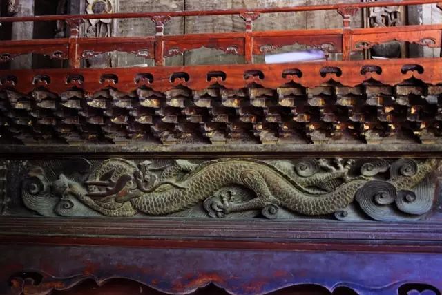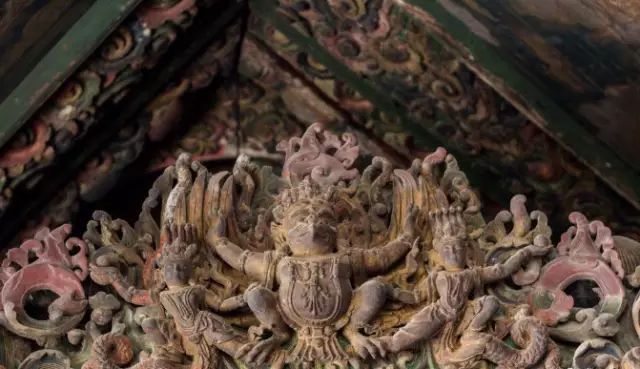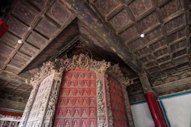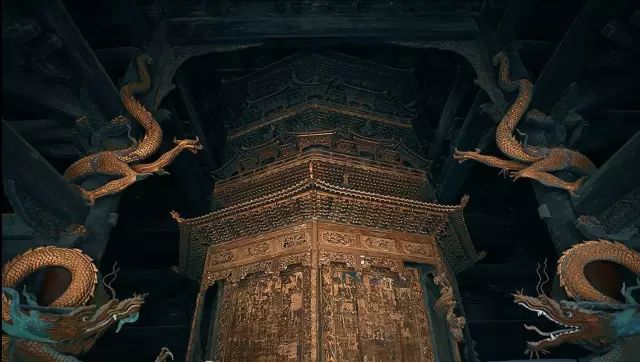 顶部雕有精美的数层莲座,一尊毗卢遮那佛,又称:大日如来佛、释迦牟尼佛,面东而坐。因为转轮藏体量宽大,佛身隐进藏殿的藻井中,必须到大殿角落才能看到。佛祖面目慈祥、体态丰腴,斜披袈裟露出一臂,衣纹飘动,显示至高无上的威严。
