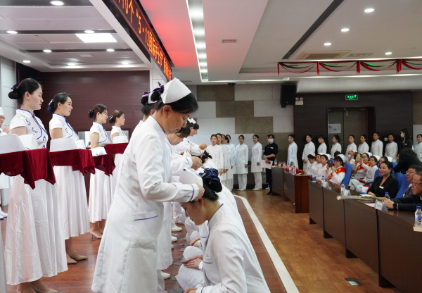表彰结束后,护士代表进行了诗朗诵,说课比赛一等奖获奖者冯霄作说课展示。伴随着音乐《感恩的心》,护士长代表为40名即将走上工作岗位的护士进行庄严而神圣的授帽仪式,带领全体护士庄严宣誓。