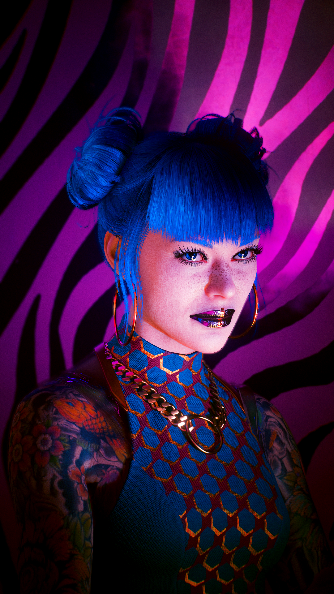 《赛博朋克 2077》云顶俱乐部前台接待员的半身特写。图片由作者本人拍摄,采用第三方 IGCS 摄影机工具确定机位,利用 ReShade 进行锐化并增加了 HDR 滤镜
