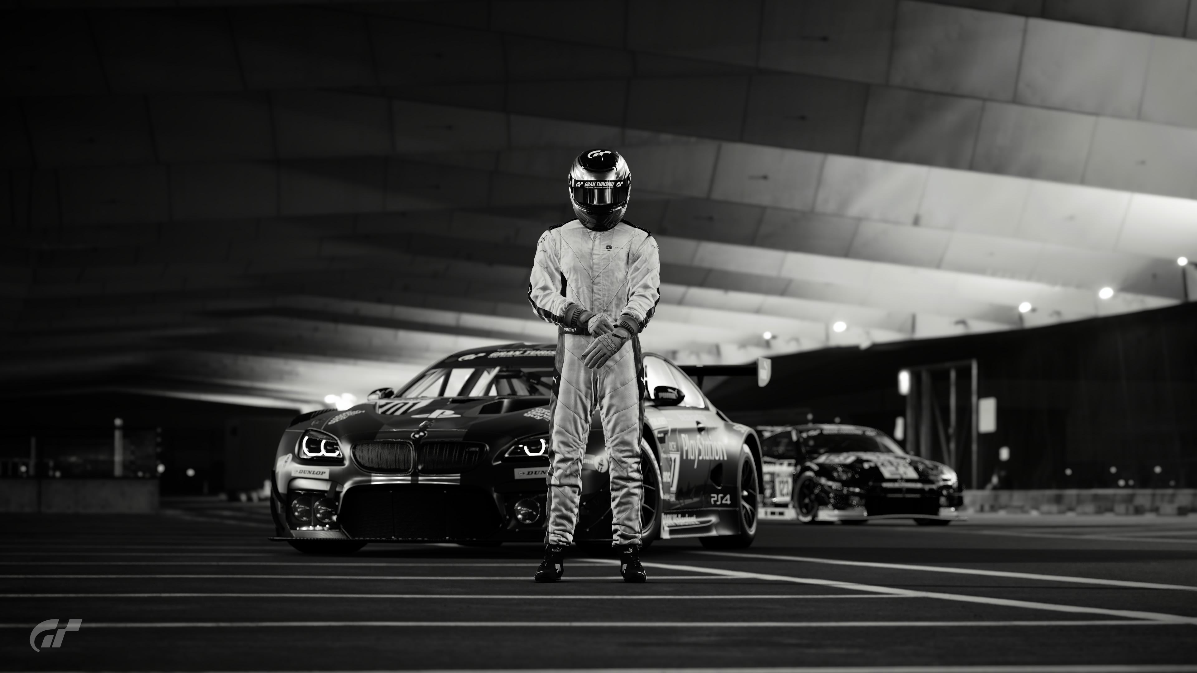 《GT 赛车》系列最新作《GT Sport》(PlayStation 4,2017)Scapes 模式截图。背景为真实照片,位于横滨大栈桥码头,车辆与驾驶员均为3D建模。驾驶员身后的车辆分别是山内一典驾驶过的 Walkenhorst Motorsport M6 GT3 以及 Schulze Motorsport GT-R Nismo GT3。本图由作者本人拍摄,光圈 F/4,快门速度 1/60,焦距 103mm