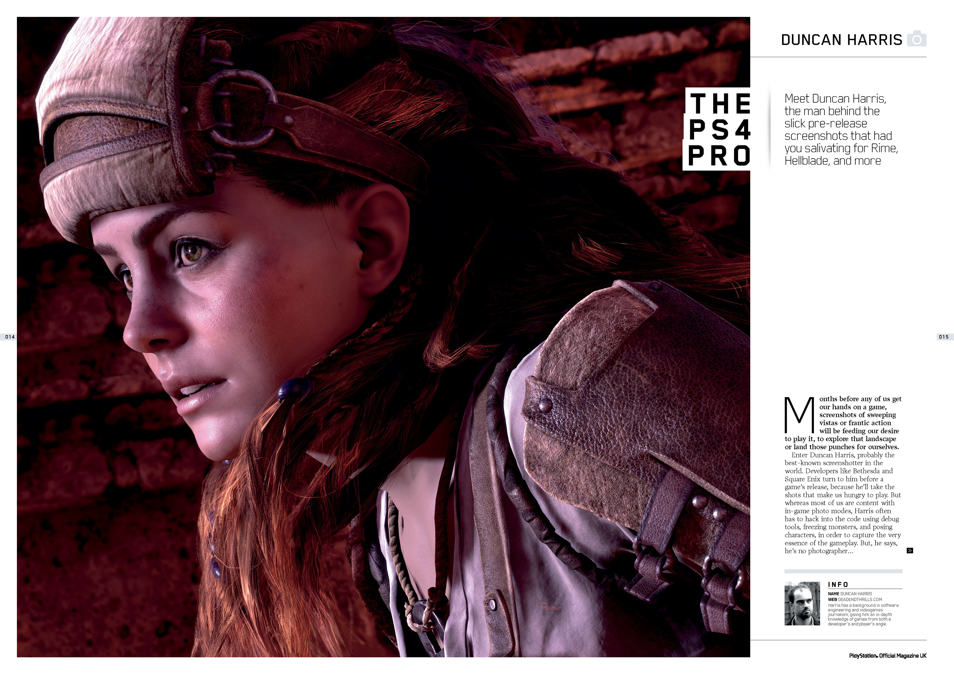 Duncan Harris 本人(右下角)以及其《地平线:零之曙光》游戏摄影作品。图片来自 OPM UK 杂志增刊《PS4 摄影模式终极指南》