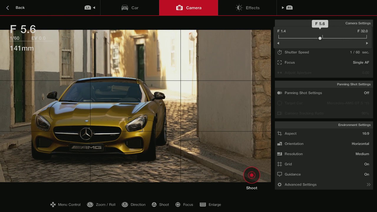 PlayStation 4《GT Sport》Scapes 下摄影模式截图,包括焦距、光圈、快门速度、曝光补偿、机位移动方式应有尽有。该图背景为真实照片,车辆为 2016 AMG GT S。图片来自网络
