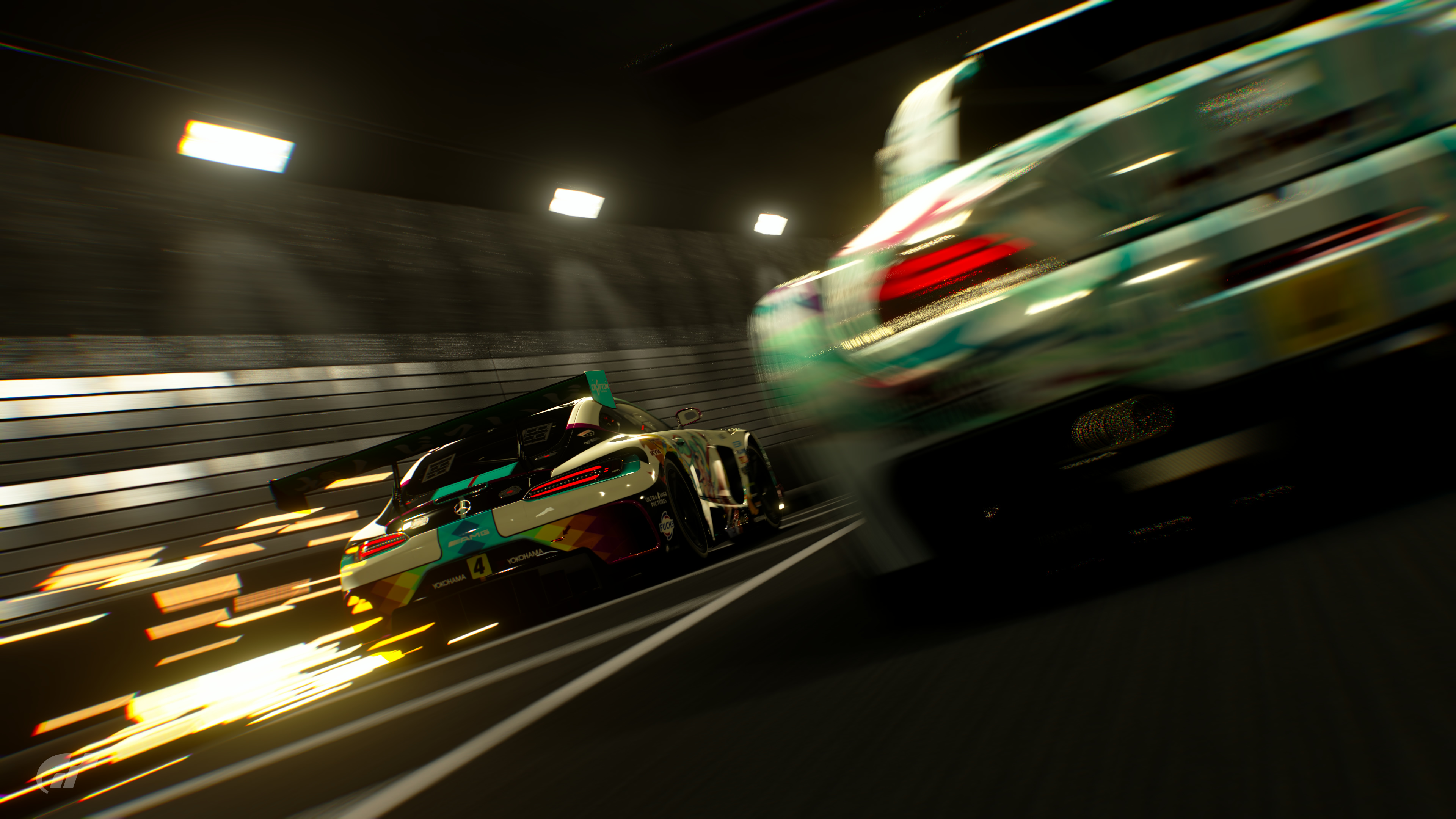 PlayStation 4《GT Sport》回放模式游戏摄影。利用斜角镜头和慢快门表现激烈的赛车追逐。本图由作者本人拍摄,位于游戏中虚构的首都高环线,车辆分别是 2016 AMG GT3 和 2012 Z4 GT3。光圈 F/5.6,快门速度 1/60,焦距 72mm