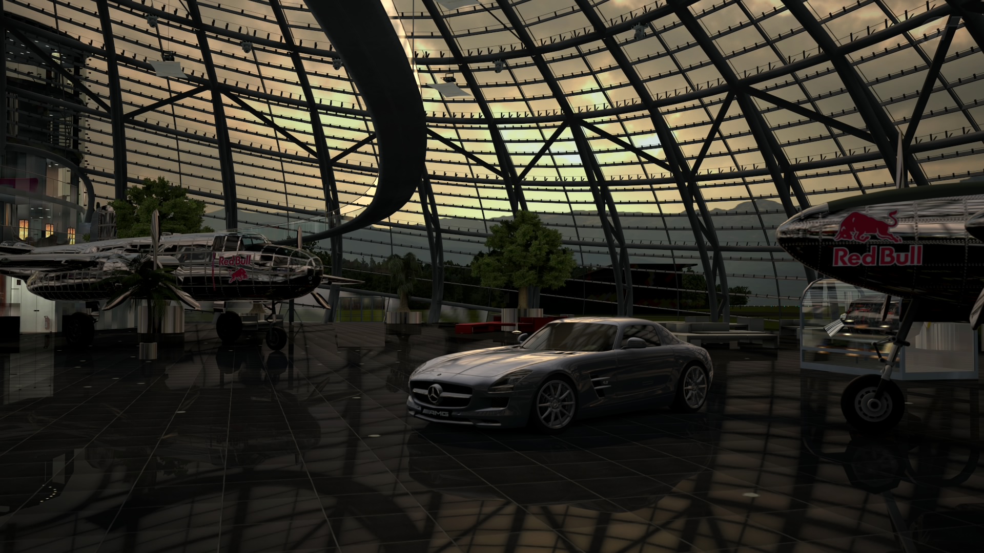 PlayStation 3《GT 赛车 5》2013 完整版 Scape 模式截图。本图由作者本人拍摄,位于红牛博物馆,车辆是 2009 SLS AMG。光圈 F/5.6,快门速度 1/60,焦距 37mm。室内场景确实需要更好的曝光才行