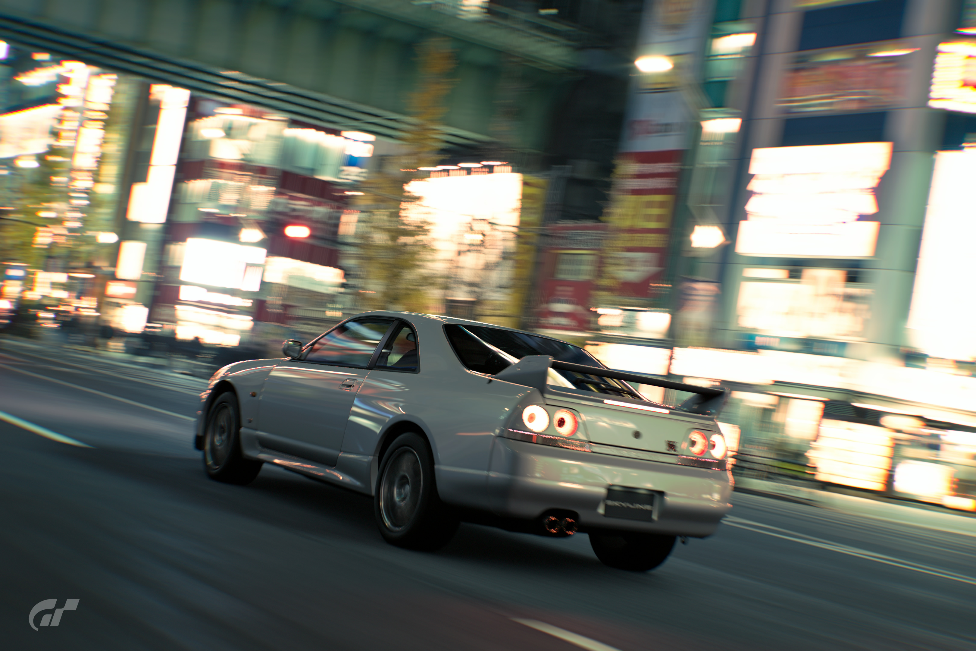 PlayStation 4《GT Sport》Scapes 模式游戏摄影。本图由作者本人拍摄,背景为真实照片,位于秋叶原,车辆是 1997 Skyline R33 GT-R V-spec。光圈 F/16,快门速度 1/30,焦距 57mm
