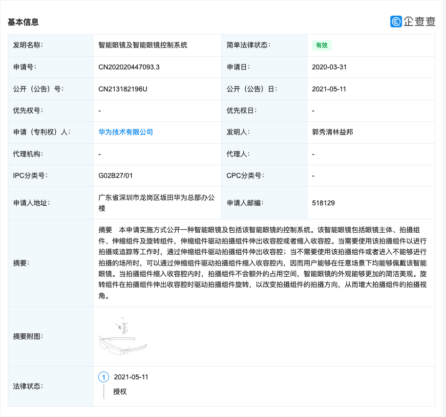 今天,从企查查网站了解到,华为技术有限公司公开了一项“智能眼镜及智能眼镜控制系统”专利,申请日为2020年3月31日,公开号为CN213182196U。该智能眼镜包括眼镜主体、拍摄组件、伸缩组件及旋转组件。