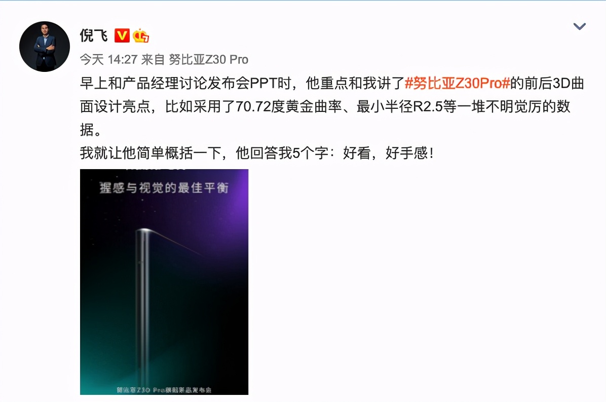 今天,中兴通讯终端事业部总裁、努比亚技术有限公司总裁倪飞发布了该机的一张海报,并表示:努比亚Z30 Pro的前后3D曲面采用了70.72度黄金曲率、最小半径R2.5等一堆不明觉厉的数据,简单来说就是好看,好手感!