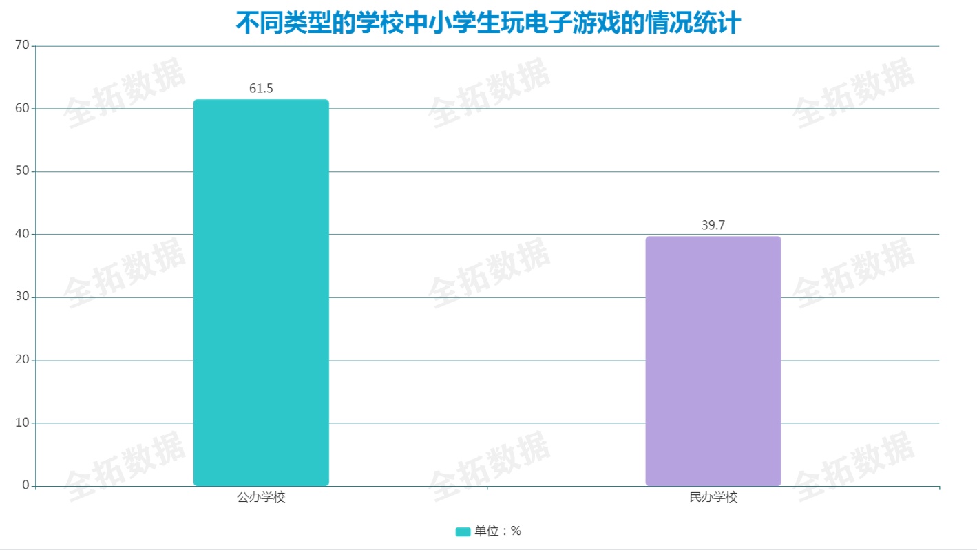 学生每周使用电子设备玩游戏的时间在不同学段、不同类型学校之间也存在不同程度的差异。小学、初中、高中学生每周玩电子游戏的时间依次递增。民办学校玩电子游戏的学生比例为39.7%,而公办学校学生玩电子游戏的学生比例更高,占比达到61.5%。