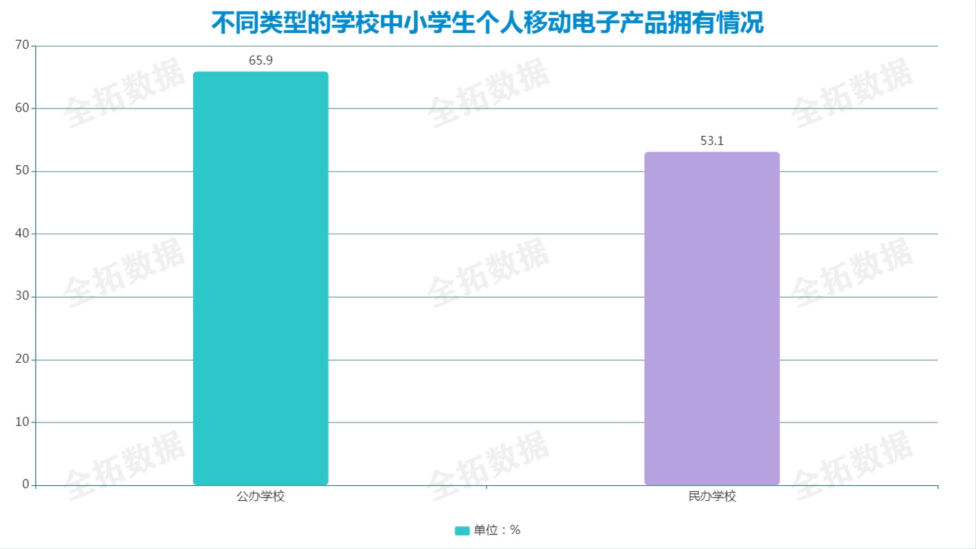 中小学生个人移动电子产品拥有情况在不同类型的学校之间存在差异。与民办学校相比,公办学校学生拥有个人专属的手机、平板电脑、电脑等电子产品的比例更高,其占比达到65.9%;而民办学校学生拥有个人专属移动电子产品的比例为53.1%。