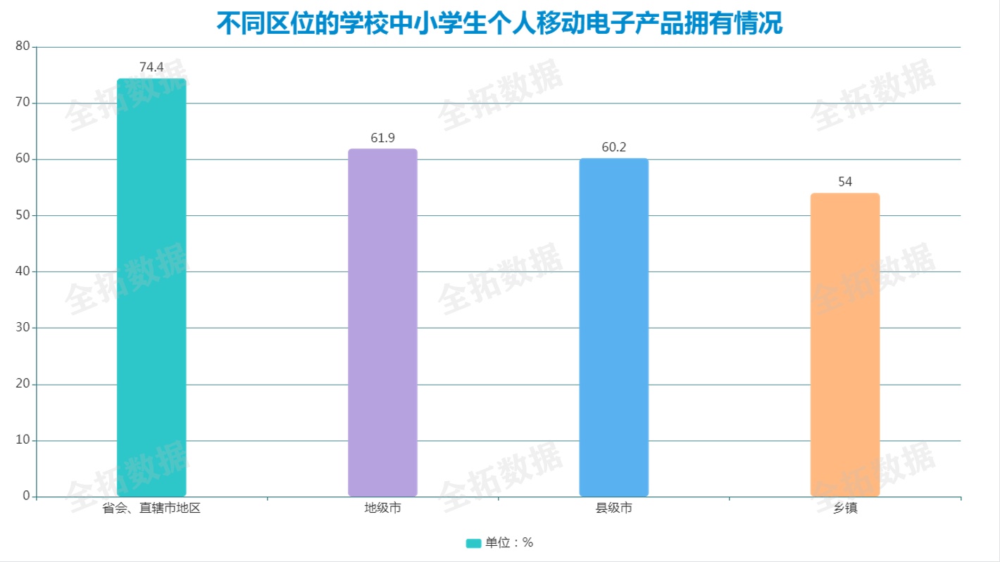 中小学生移动电子产品拥有情况在不同区位存在差异。学校所处的地区地理层级越高,学生拥有电子移动设备的比例越高。省会、直辖市地区学生拥有电子移动设备的比例为74.4%,地级市的比例为61.9%,县级市的比例为60.2%,乡镇的比例为54%。