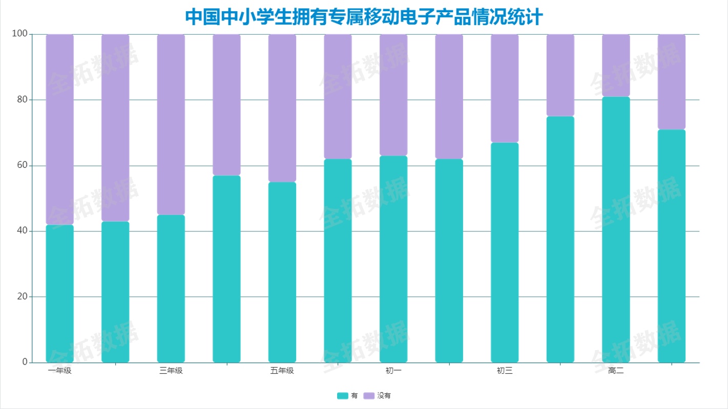 据全拓数据调查显示,超过六成的学生拥有个人专属的电子产品(平板电脑、电话手表、手机)。其中,高中生拥有个人专属数码设备的学生比例最高(占比77.4%),初中生为64.6%,小学生则占比50.7%。此外,年级之间存在明显差异,年级越高,拥有移动电子产品的学生比例也就越高(高三学生除外)。