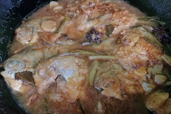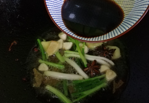 6 锅里留底油,放入八角香叶,葱姜蒜炝锅,调入调好的料汁