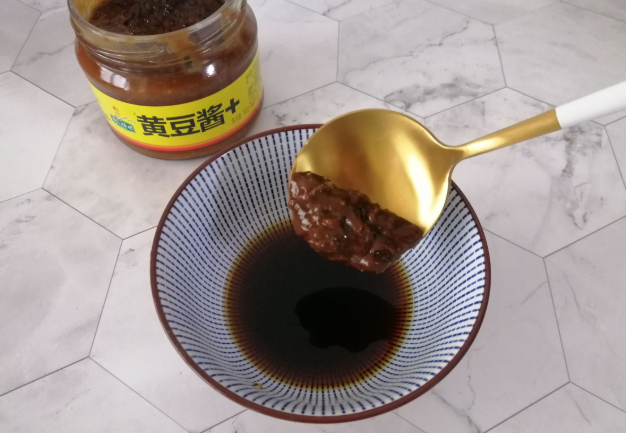 5 调一个料汁,放入一勺黄豆酱、一勺生抽、一勺老抽、少许白糖、少许醋调匀