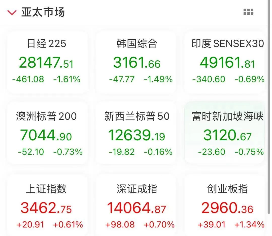 截至目前,日经225、韩国综合指数跌逾1%。
