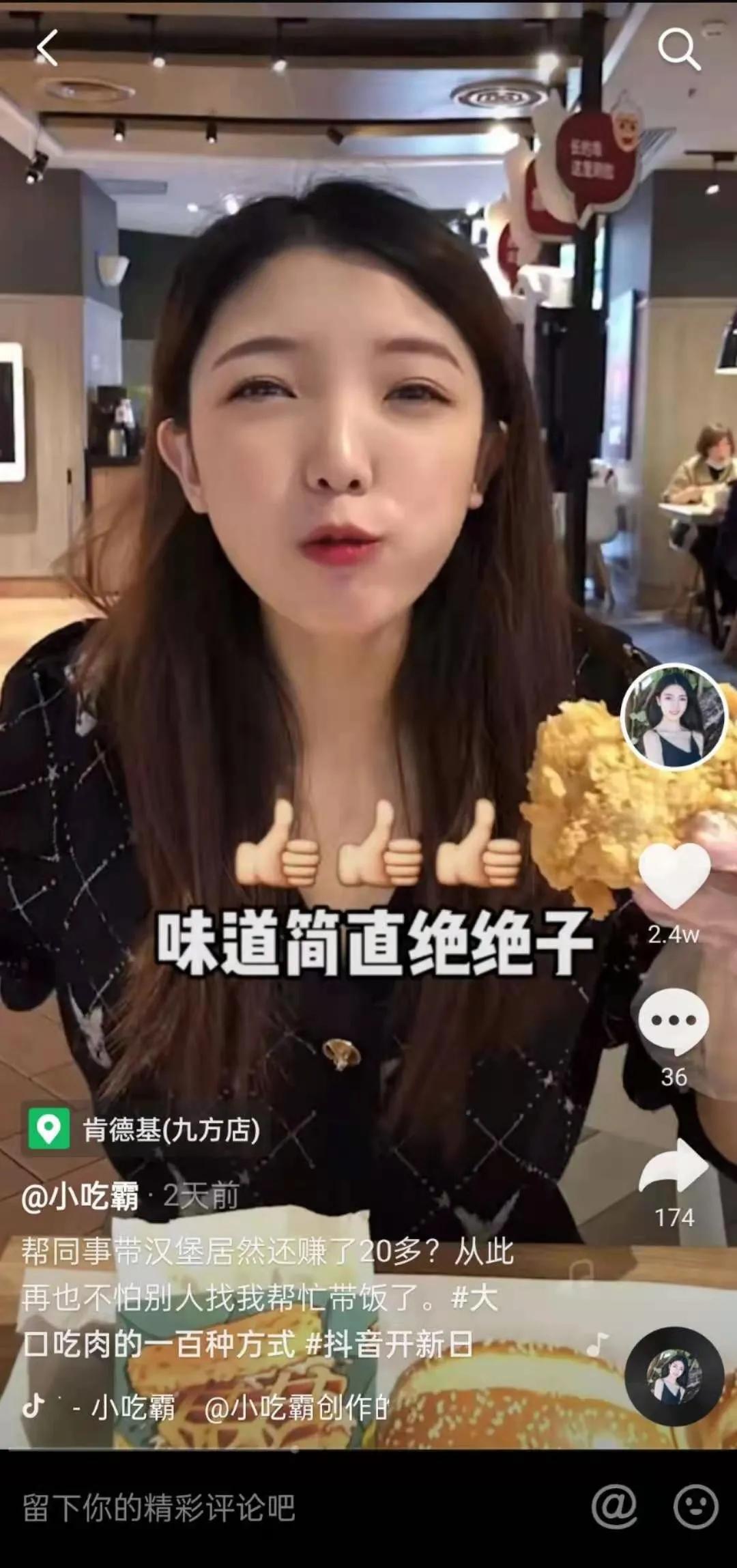 紧随其后是一波肯德基与抖音开新日的“联合蓄水”:双方共同在抖音站内邀美食达人大口试吃肉霸堡。达人们针对肯德基肉霸堡“没有面包,double肉量"的产品特点尽情放飞脑洞,相关内容在#抖音开新日#、#大口吃肉的一百种方式#话题下迅速发酵,助力新品出圈。