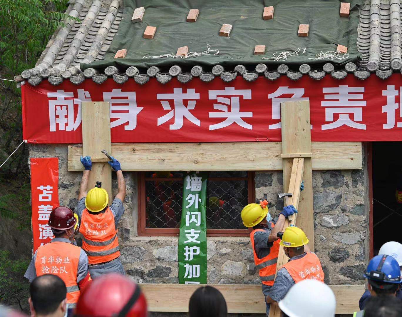 防汛抢险队员演练外墙歪闪支护。新京报记者 陶冉 摄