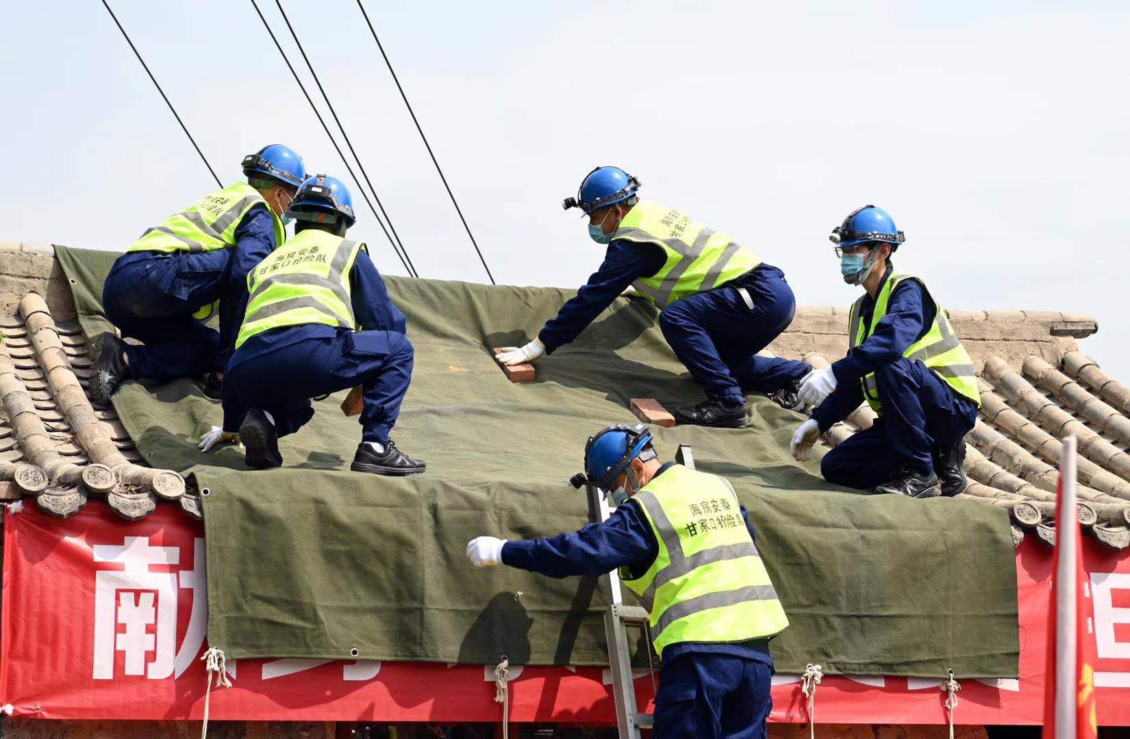 演练现场,防汛抢险队员对漏雨房屋进行苫盖。新京报记者 陶冉 摄