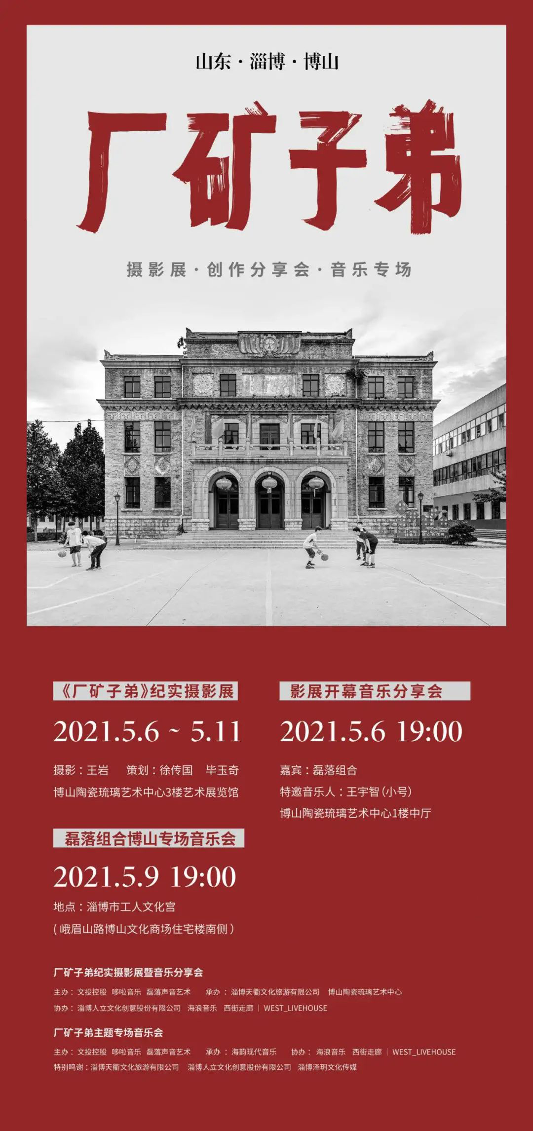 2021年5月6日到5月11日,北京哆啦音乐文化有限公司签约乐队磊落组合在山东博山开展为期6天的“厂矿子弟”公益影音系列活动,包含纪实摄影展、音乐分享会、音乐大师课和专场音乐会四部分内容。活动从“厂矿子弟博山纪实”影展开始,在淄博博山陶瓷琉璃艺术中心三楼举行。这场纪实摄影展,是同为厂矿子弟的王磊哥哥王岩拍摄的,影展的内容除了博山电机厂大院的老照片,以及社区身边的博山人民群像,还有几十年来王磊的生活轨迹。