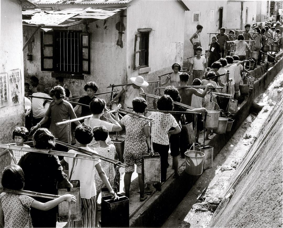 香港供水4小时实施期间,找寻水源烧饭、洗衣,是妇女们日常生活的重责,挑水的行列亦以女性为主。