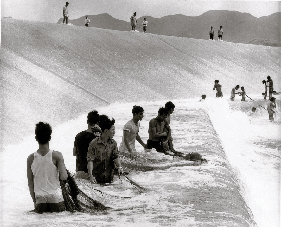 为了接收东江水,香港于上世纪60年代兴建船湾淡水湖。图为船湾淡水湖建成后,1969年8月第一次满溢,市民于溢洪口嬉水、捕鱼。