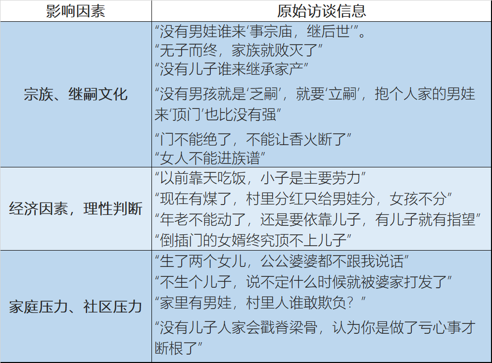 西安交通大学的研究者2010年左右在陕西访谈,总结出偏好男孩的几个因素,比如宗族、继嗣文化;现实经济因素;家庭社区压力。