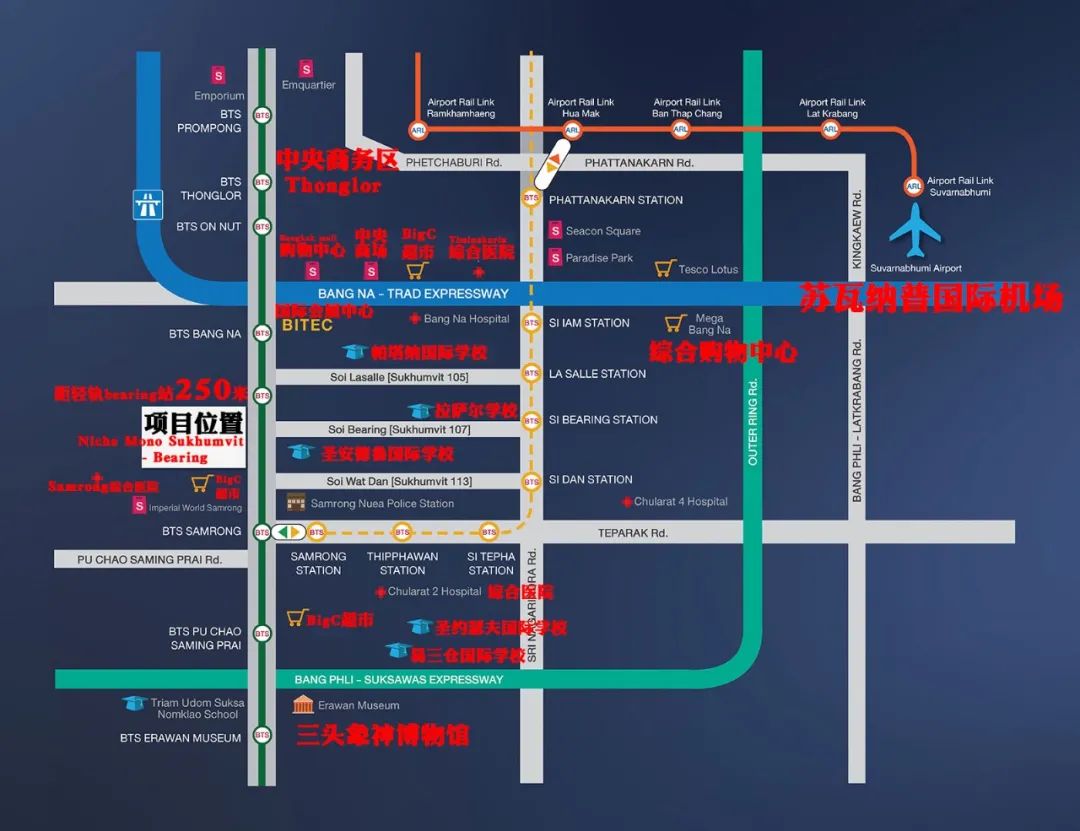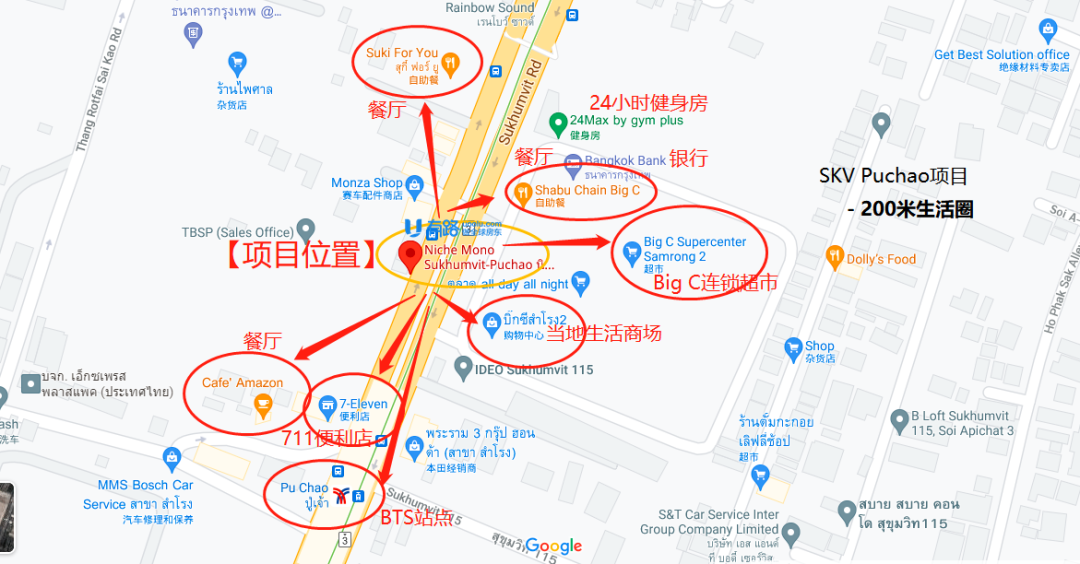 Mono Bearing 和 SKV Puchao 两个项目都位于素坤逸沿线热区上,在曼谷未来的副市中心邦纳地区附近,未来必然会受BTS素坤逸沿线的经济外溢影响,成为下一个经济辐射区,带动周围产业、商圈、人才的集聚,因此邻铁的土地也成为了房产开发商眼中的“肥肉”。