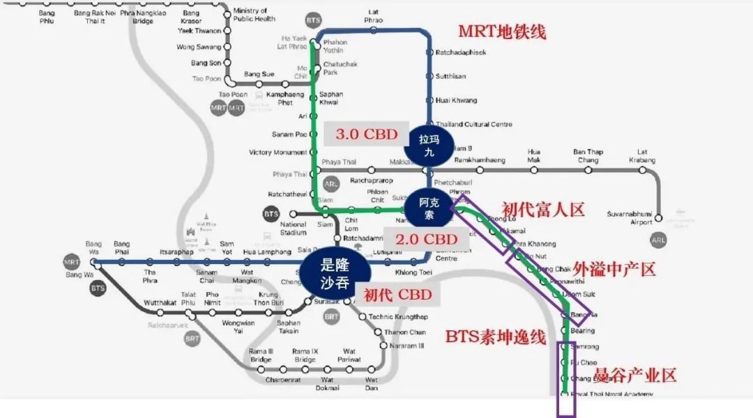 因此,曼谷的经济热区一般会沿着轨道交通呈带状或条状分布,近年来MRT蓝色和BTS绿色沿线已形成了三大经济CBD:沙吞、Asoke、RAMA9,并且这些区域的产业商业集聚已趋于饱和,目前曼谷的经济正沿着BTS绿色向素坤逸沿线地区外溢。