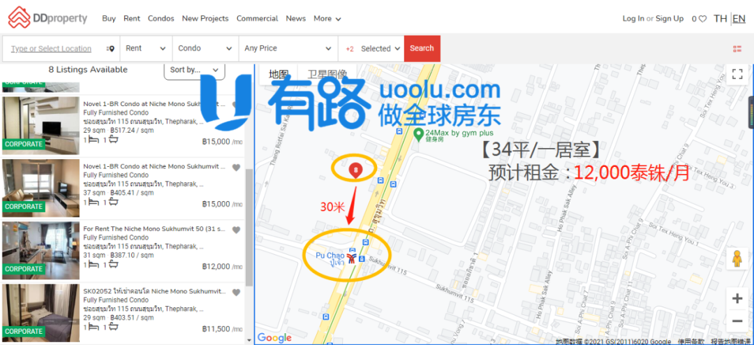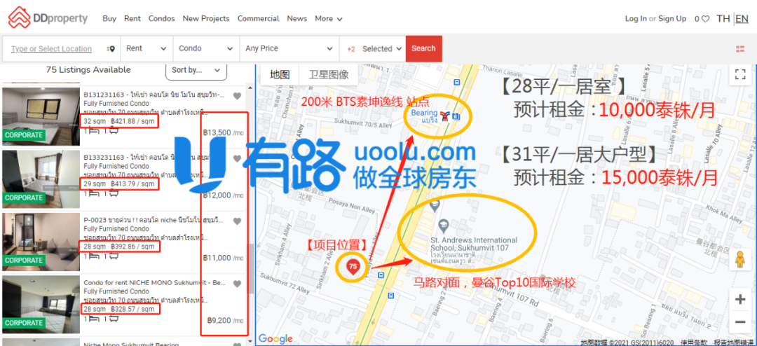 小路通过泰国权威房屋租赁网站DD property搜索该区域的studio(26平左右)户型公寓的租金价格,平均在13625泰铢/月,约合人民币2800元/月左右,租金收益非常可观!