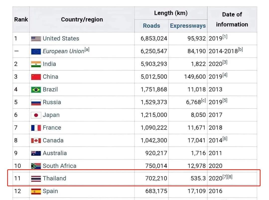泰国一直是东南亚国家中的“优秀代表”,近年来的经济发展也是非常瞩目,像东部经济走廊EEC、“中泰高铁”这样大基建项的推进都预示着泰国要想促进经济发展,在交通网建设上必须下足“功夫”。据全球路网规模数据统计,泰国位列全球第11名,东盟国家中第一名。2020年泰国的路网总规模702,201 KM,并且每年增长幅度明显,可见泰国对于交通建设的重视程度。