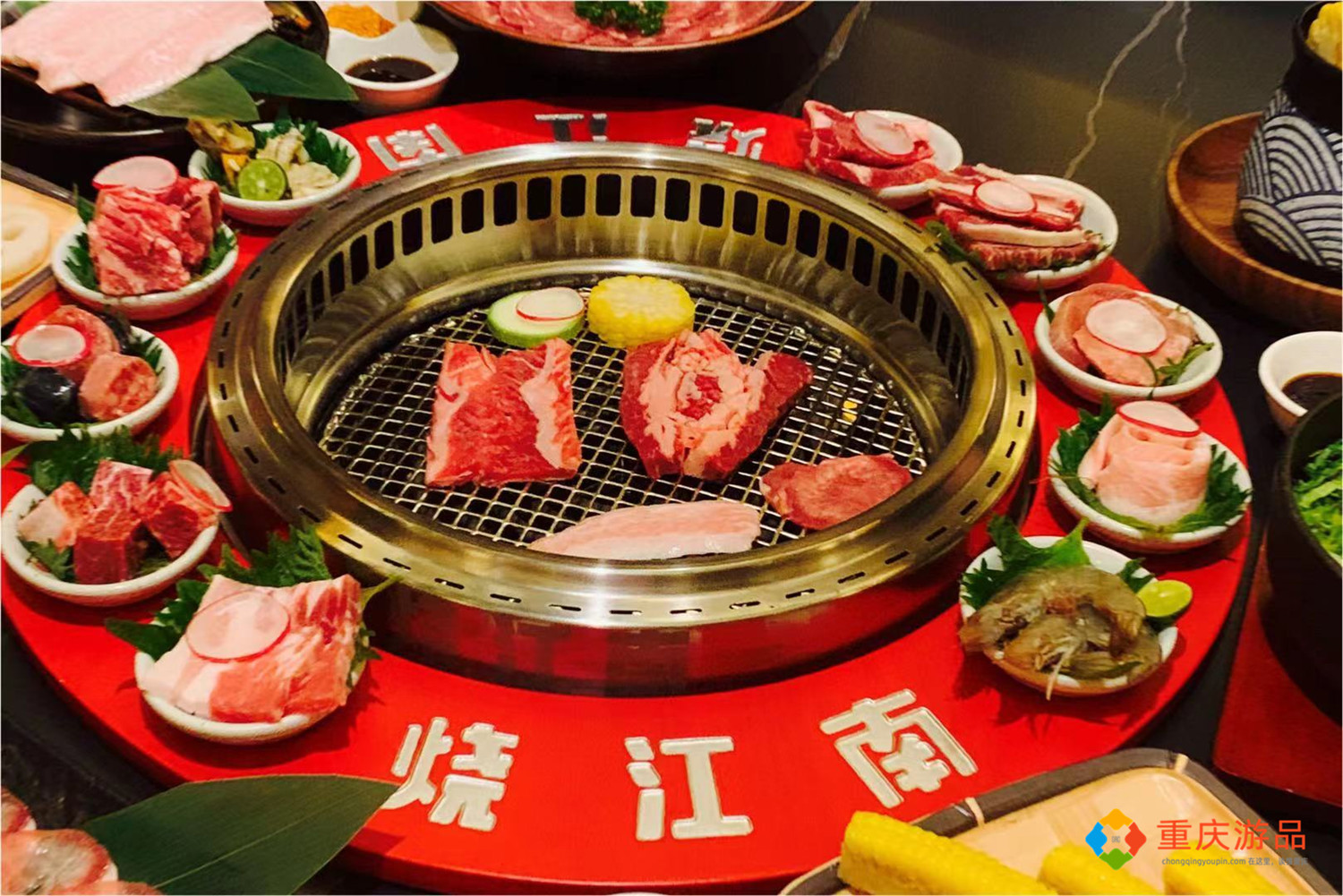 由10种不同种类的食材组成的烧肉拼盘是必点,10个小碟子放在一个木制的大圆盘上,上桌后直接放到烤炉上,大小刚刚好。