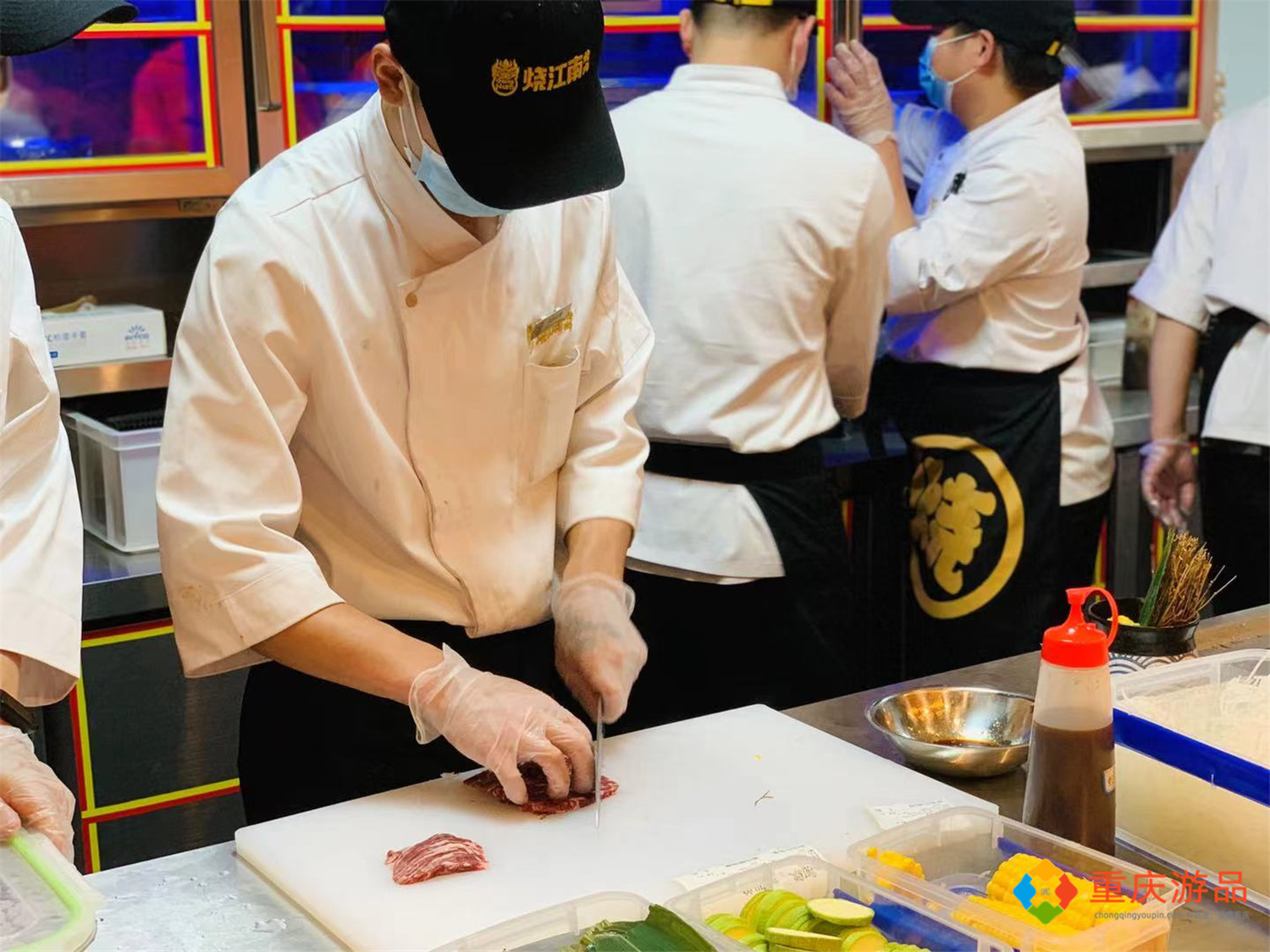 餐厅中间的部分有一个超大的开放式厨房,七八个厨师正在忙碌着为客人备菜,取肉、拿肉、切肉、摆盘……动作非常有范,每一步都有严格的把控,一气呵成。