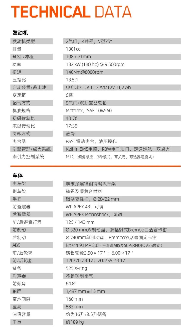 KTM 1290 SUPER DUKE R 2021款,搭载1301cc排量的,Lc8 V型双缸水冷发动机,最大功率132kw(180Hp)/9500rpm,最大扭矩140Nm/8000rpm,输出数据与海外版保持一致。