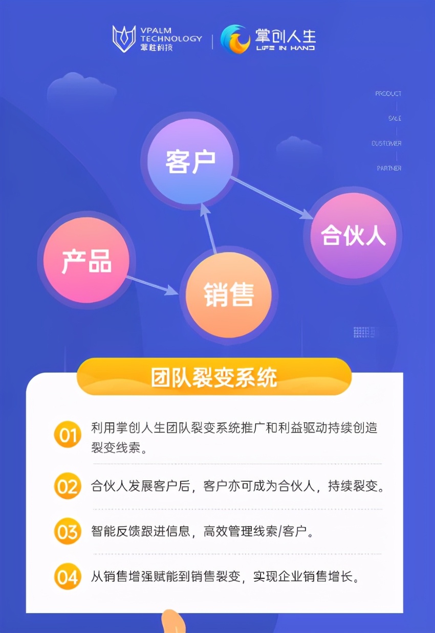 面对日益激烈的市场竞争,企业最大危机不在于当前利润多与少,而在于团队是否能良性循环裂变发展。掌创人生围绕“宣传、销售和团队裂变”三大核心需求打造,是一款帮助企业经营管理的轻资产、智能多元化营销工具、运营系统。掌创人生的团队裂变系统更是一个帮助企业、品牌构建全新团队裂变思维,助力企业多场景营销做全国生意的营销裂变系统。