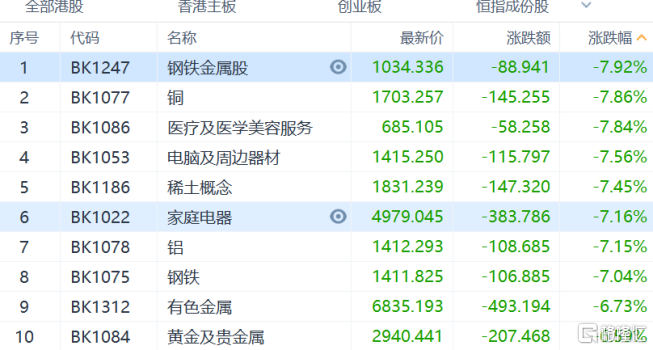 港股方面,钢铁亦领跌大盘,跌幅近8%,铜、铝等有色板块亦断崖式下跌。
