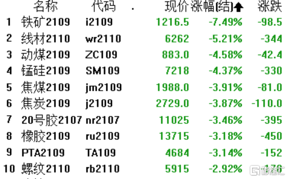 期货方面,黑色系盘中跳水遭重挫,铁矿石领跌,动力煤跌超4%,焦煤、焦炭跌逾3%,螺纹钢大跌2.92%。截至收盘,铁矿石主力合约跌7.49%,报1216.5元。