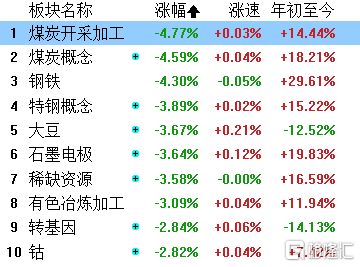 今日,周期股集体熄火,A股方面煤炭、钢铁、有色纷纷大跌。钢铁板块方面,酒钢宏兴跌超9%,重庆钢铁、鞍钢股份跌超8%,太钢不锈、新钢股份跌超7%,宝钢股份跌超6%,板块内30余只个股下跌。