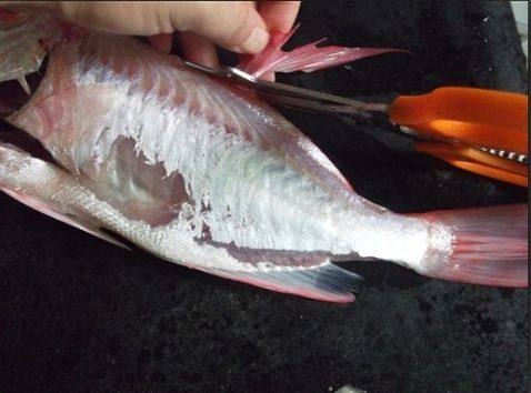 2 剪去边上的刺,刺非常坚硬,容易被刺伤,鱼皮也较粗糙去掉