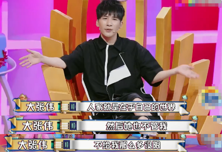 官宣后,大张伟就更没顾忌了,在节目中也直接自曝了原因和刘迎组成家庭的原因——“她有个人的精神世界,对我不设限制,不爱管我。”